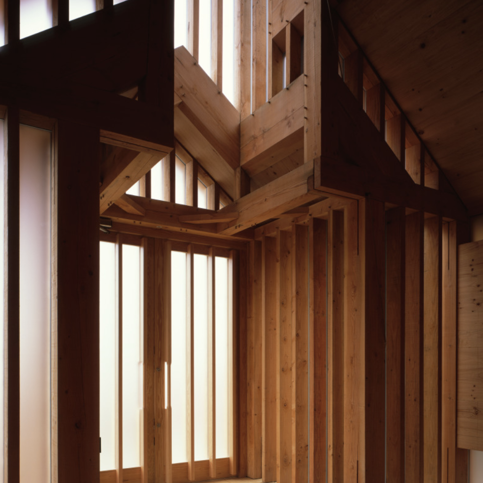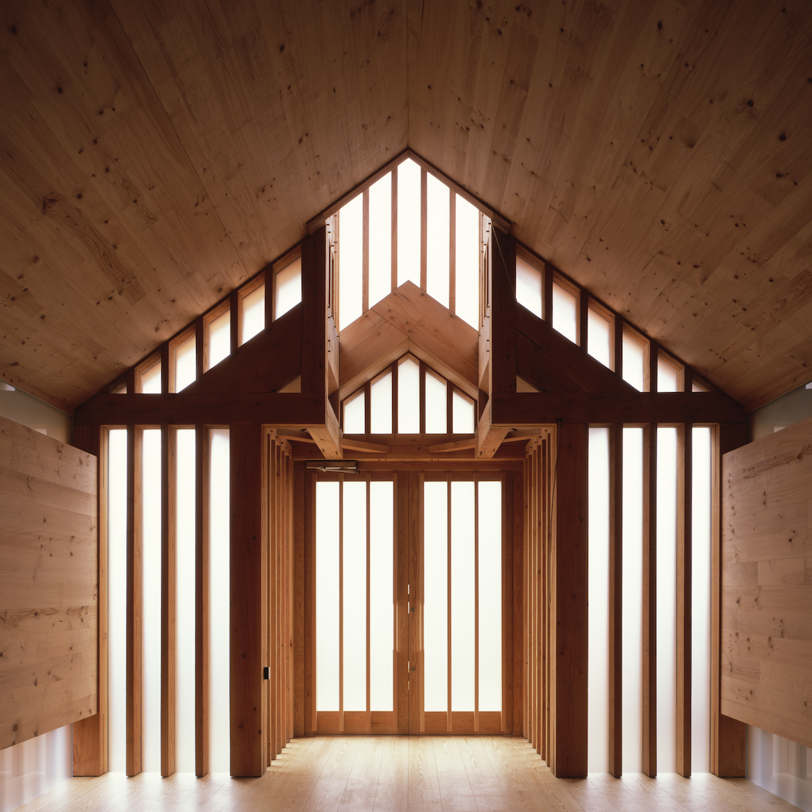 The design draws inspiration from the rural wooden churches in Belarus and aims to combine their traditional architectural language with contemporary building technologies and concepts. The materials palette was restricted to wood and glass to reflect the austere and tranquil beauty of traditional wooden churches.