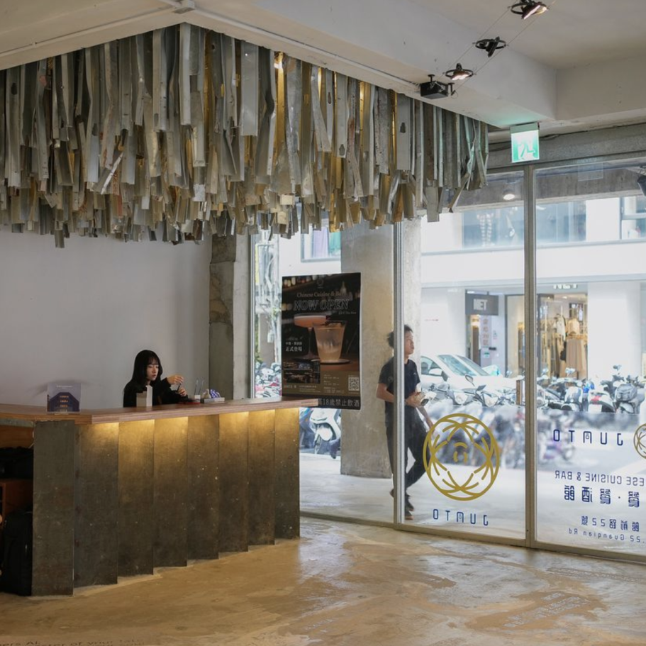 Apart from Tszwai So’s pastel drawings behind the design concept, the permanent exhibits are embedded within the building fabrics. These include a collaborative artwork of quotes on AI and human creativity by over 50 artists on the floor and columns of the ground floor, a memorial for the client’s late mother, as well as a reception desk and chandelier made of building waste found on site.